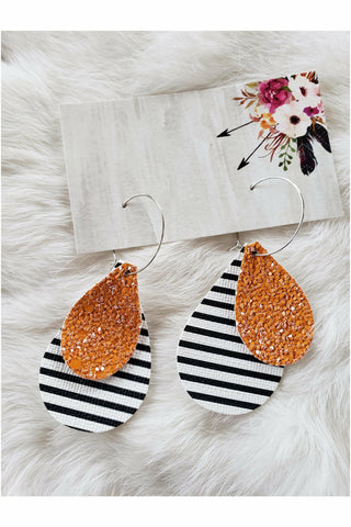Black/White Stripes & Orange Glitter Stacked Teardrop Earrings