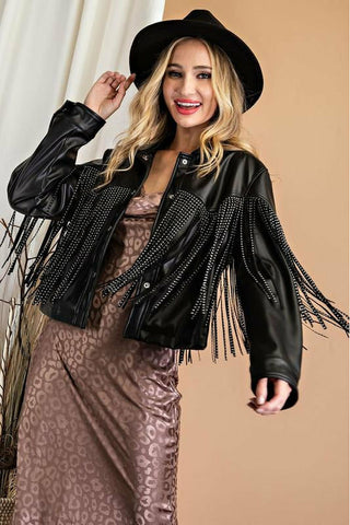 Faux Leather Jacket with Studded Fringe Detail - Black