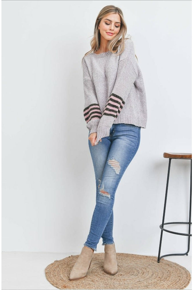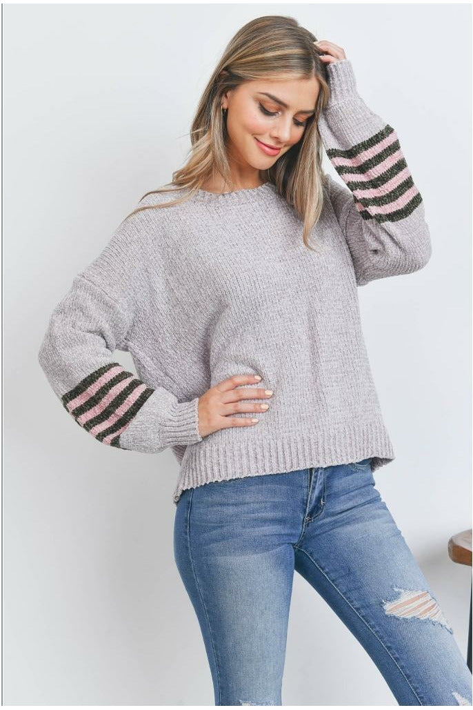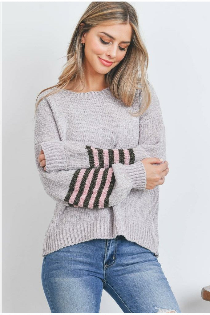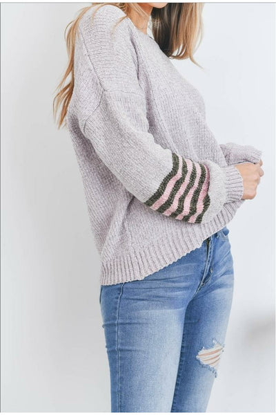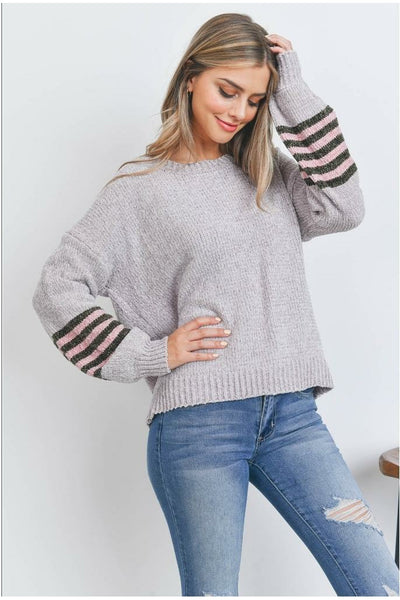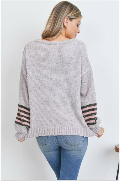 Grey Knit Sweater with Pink/ Chocolate Striped Sleeves